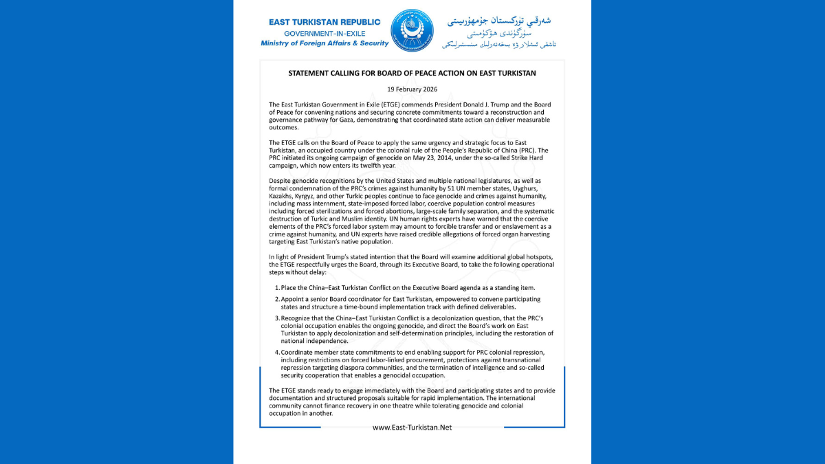 East Turkistan, what Beijing calls “Xinjiang (New Territory),” is the focus of a new appeal by the East Turkistan Government in Exile urging President Donald Trump’s Board of Peace to add the China–East Turkistan conflict to its executive agenda. In a statement dated February 19, 2026, the exiled government called for a dedicated board track and coordinated member-state commitments on accountability measures and protections for East Turkistani communities.