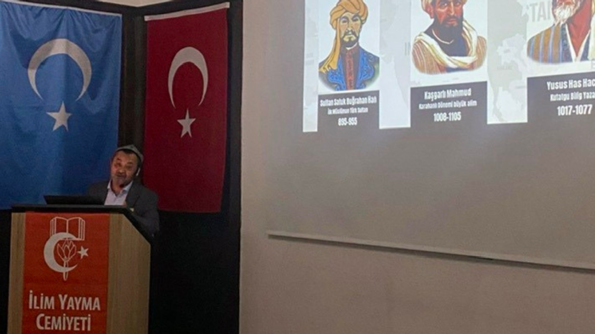 Uyghur journalist Mirkamil Kashgari presents the plight of East Turkistan at the Ilim Yayma Cemiyeti. Credit: Ilim Yayma Cemiyeti